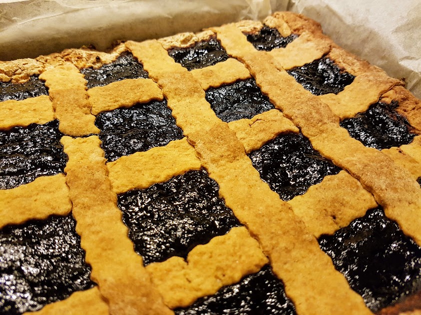 Bucherella con i rebbi della forchetta l’impasto che hai precedentemente steso sulla teglia e a cui avrai fatto i bordi un pò più alti della base; versaci la marmellata,( io utilizzo preferibilmente una marmellata biologica ai mirtilli).