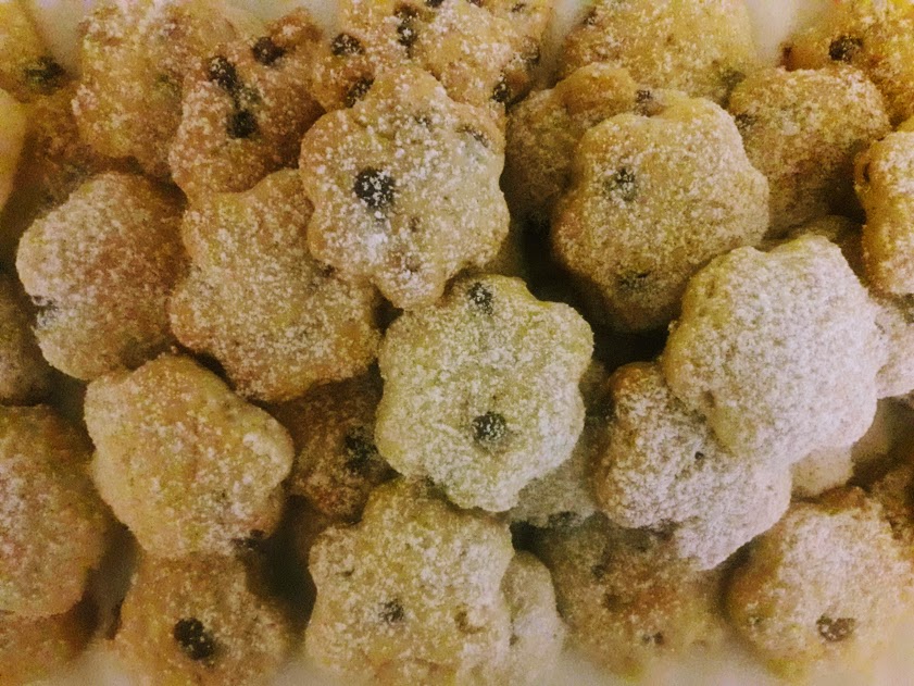 250 gr di fatina tipo 1, 50gr di burro, 40gr di olio di semi, 1 uovo, 80gr di zucchero, 1/2 scorza di limone grattuggiata, 1/2 bustina di lievito per dolci, (se occorre latte), pinoli e gocce di cioccolato.
