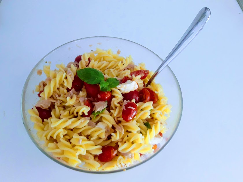 400 gr di fusilli, 250 gr di tonno all’olio extravergine di oliva, 2 mozzarelle, pomodorini, olio extravergine di oliva, origano, sale e pepe.