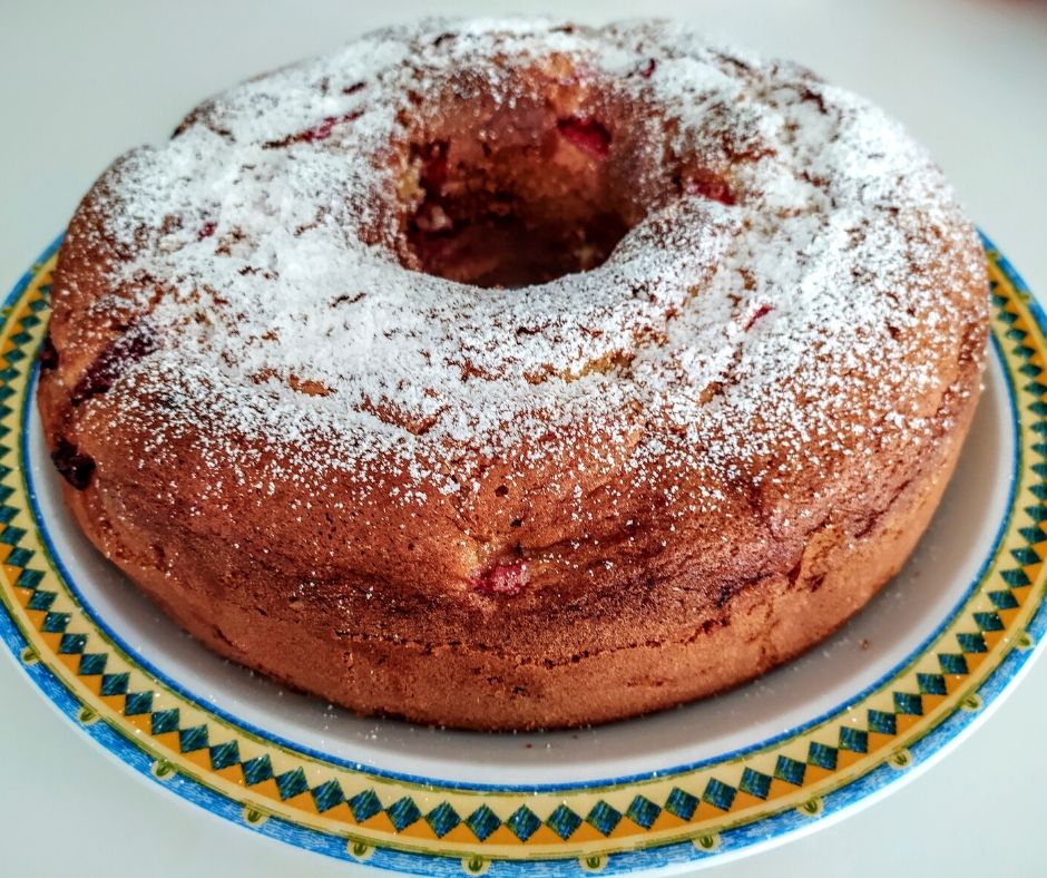 4 Uova, 320 g di farina, 230 g di zucchero, 150 ml di olio di semi di girasole, 150 ml di yogurt alle fragole, scorza grattugiata di un limone non trattato, 1 bustina di lievito per dolci, fragole.